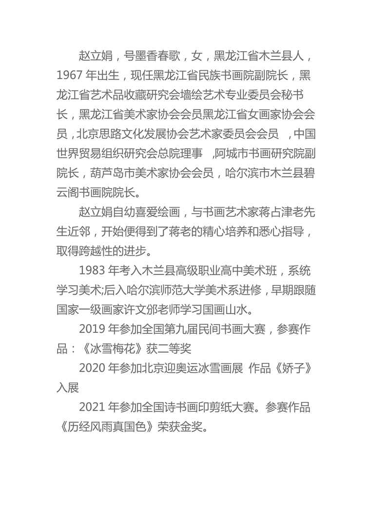 赵立娟,号墨香春歌,女,黑龙江省木兰县人,1967年出生,现任黑龙江省民族书画院副院长,黑龙江省艺术品收藏研究会墙绘艺术专业委员会秘书长,黑龙江省美术家协会会员黑龙江省女画家协会会员,北京思路文化发展协会艺术家委员会会员 ,中国世界贸易组织研究会总院理事 ,阿城市书画研究院副院长,葫芦岛市美术家协会会员,哈尔滨市木兰县碧云阁书画院院长。